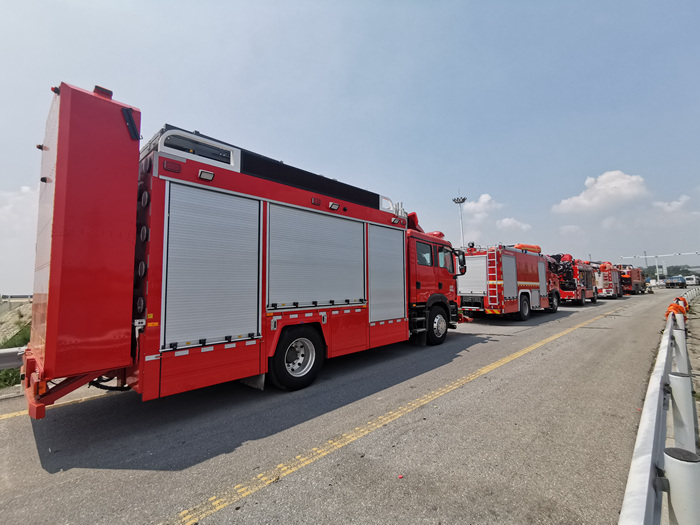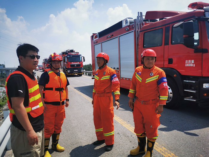 高远圣工应急救援消防车,配合江苏消防支队的远程供水车在荷宝高速凤泉口、新中大道前辛庄路口进行清障、警戒、抽水任务。