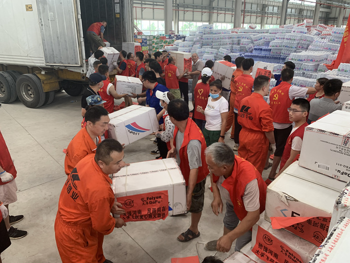 在暴雨过后,集团员工自发组成志愿者团队,连续多日参与新乡市高新区对外接收救援物资的分派点进行物资搬卸。